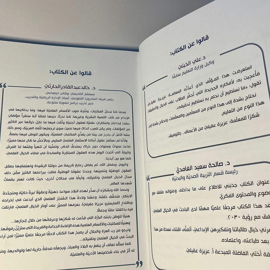 آراء عن كتاب (تقنيات الخيال العلميّ) لشخصيات تمتلك عُمق الإلمام والفَهْم العلميّ‘ إلى جانب فصاحة الصياغة والتعبير، مع صدق الإقناع؛ لنشر المعرفة العلميّة، وإيصال ما لديهم إلى جميع المهتمين ببناء العقول، وتنشئة العلماء والمخترعين والمبتكرين. "إنّه واجبٌ وطنيّ".