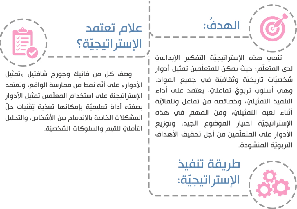 تنمّي هذه الإستراتيجيّة التفكير الإبداعيّ لدى المتعلّم؛ حيث يمكن للمتعلّمين تمثيل أدوار شخصيّات تاريخيّة وثقافيّة في جميع المواد، وهي أسلوب تربويّ تفاعليّ، يعتمد على أداء التلميذ التمثيليّ، وخصائصه من تفاعل وتلقائيّة في أثناء لعبه التمثيليّ، ومن المهم في هذه الإستراتيجيّة اختيار الموضوع الجيد، وتوزيع الأدوار على المتعلّمين، وتدريبهم من أجل تحقيق الأهداف التربويّة المنشودة.