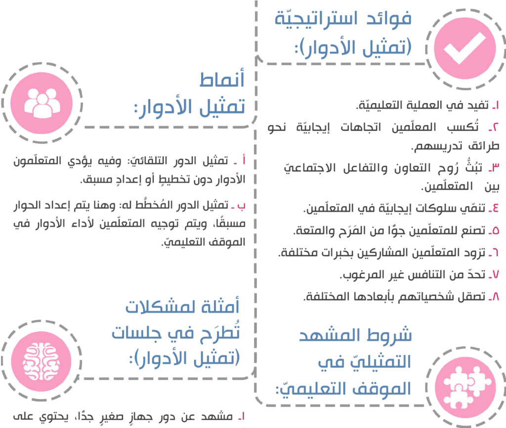 5ـ توزيع الأدوار على المتعلّمين، مع الانتباه لأهمية مناسبة الأدوار لصفات كلّ متعلّم.