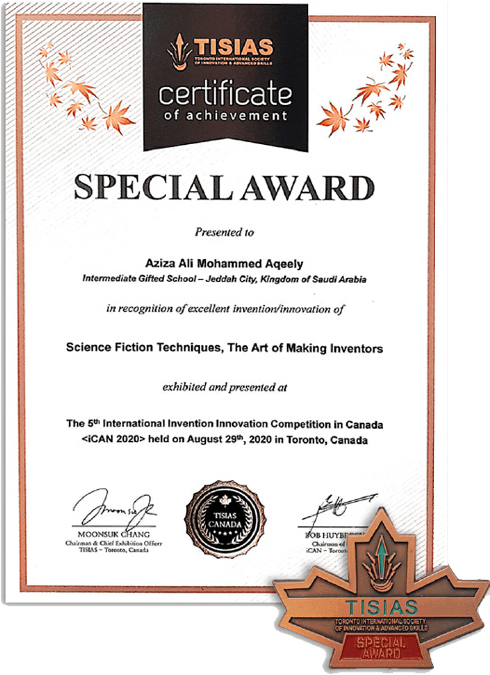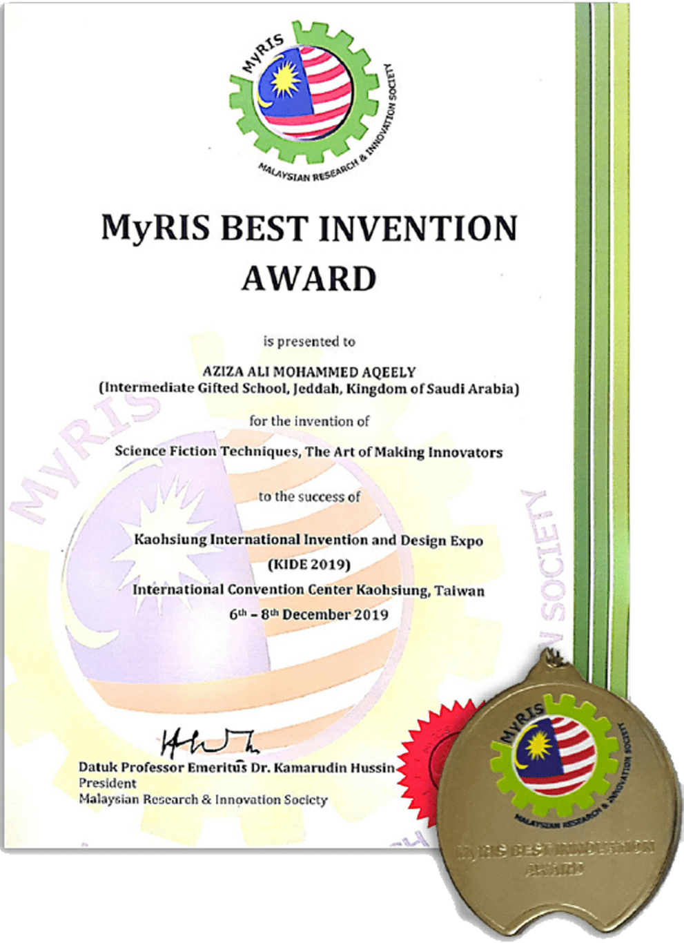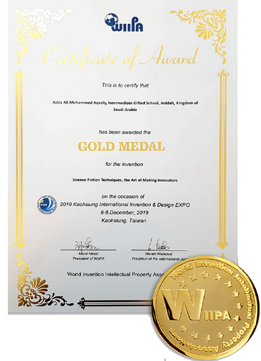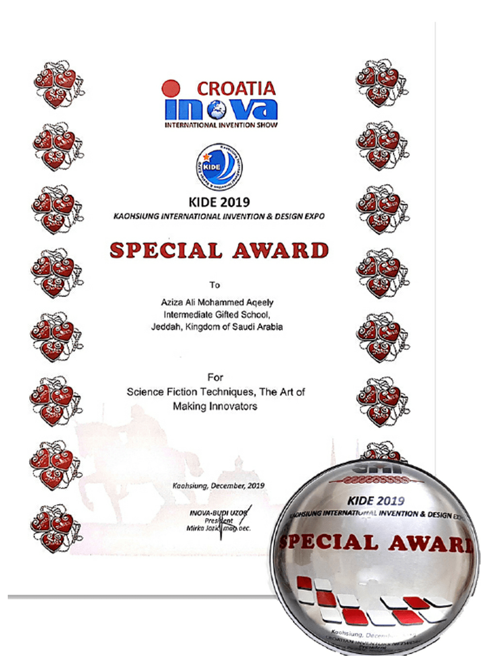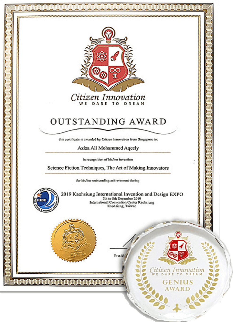 حازت تجربة الخيال العلميّ علي الميدالية الذهبيّة، وثلاث شهادات تكريم خاصة من (سنفافورة، وماليزيا، وكرواتيا ) في معرض : Kaohsiung International Inventions&Design Expo (Kide, 2019) في مدينة كاوشونج بدولة تايوان. وحصلت المؤلفة عزيزة على الميدالية الذهبية في معرض iCAN الدوليّ الذي عُقد في 29 أغسطس 2020م لمشاركتها بتجربة كتاب {تقنيات الخيال العلميّ}، كما حصلت على جائزة خاصة من دولة كندا.