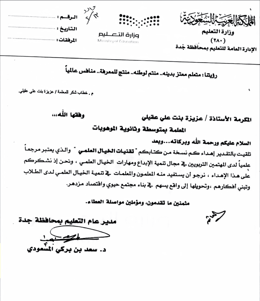 كما حازت المؤلَّفة على إهداء وتقدير من مدير عام التعليم بمحافظة جدة.