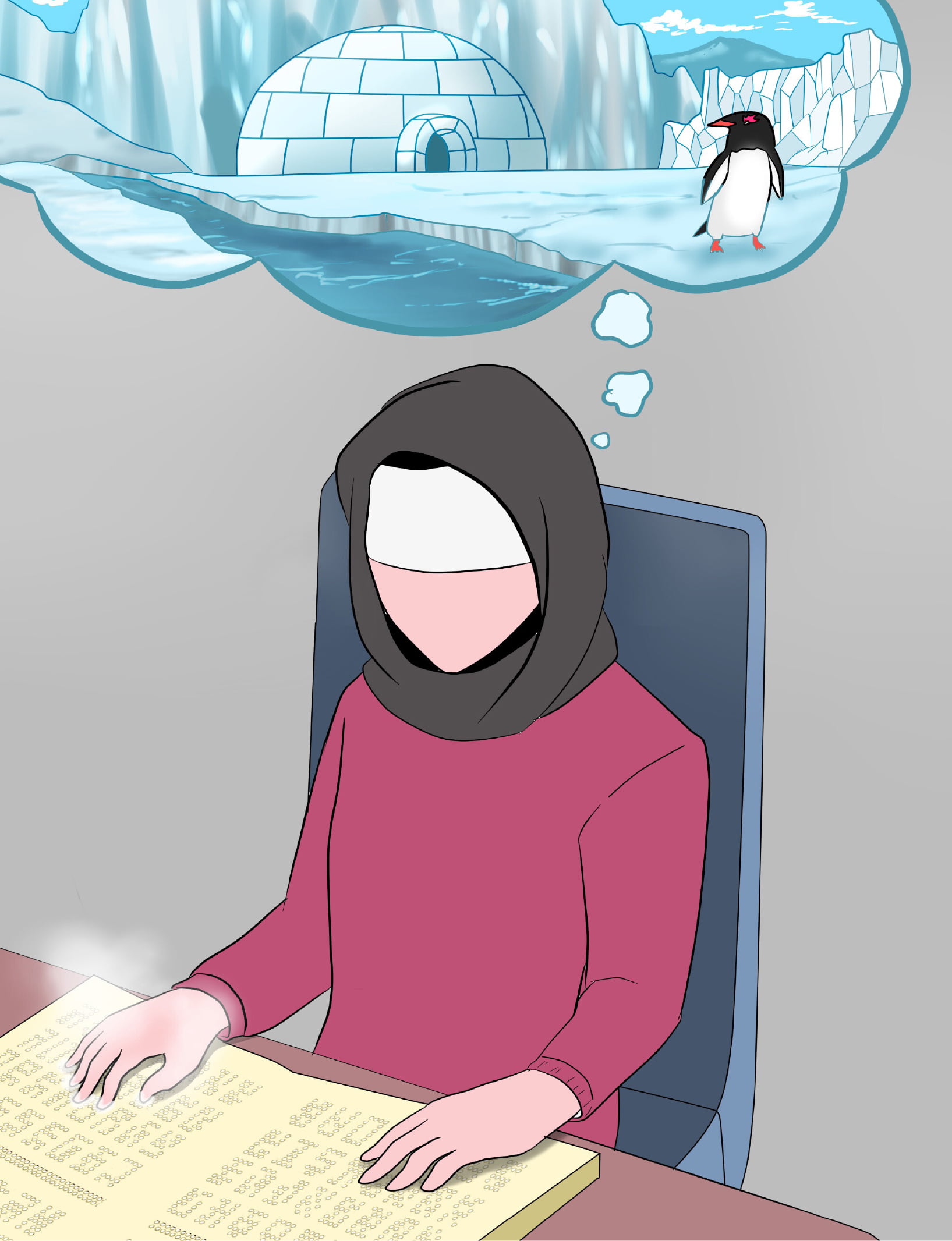 مها: صنعت كتابًا يحتوي على عدة قِصَص يمكن للمصابين بالعمى أن يشعروا بكل ما في هذا الكتاب من مشاعر وأحاسيس من خلال لغة برايل التي تعتمد على النقاط؛ فمثلًا إن كانت القصة تتحدث عن شخصية تعاني من شدة البرد، فإن القارئ سيشعر ببرودة عند لَمْس الحروف، وإن كانت الشخصية في القصة تتألم؛ فسيشعر القارئ بوَخْز بسيط في إِصبَعه، وبهذا فإنه سيتخيل الصورة، ويشعر بكل ما في القصة بصورة أكبر.