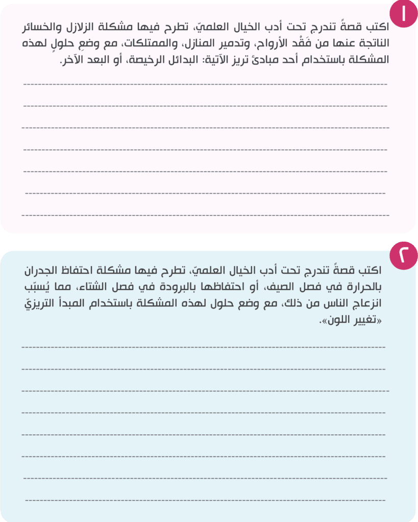 1ـ اكتب قصة تندرج تحت أدب الخيال العلميّ، تطرح فيها مشكلة الزلازل والخسائر الناتجة عنها من فَقْد الأرواح، وتدمير المنازل والممتلكات، مع وضعِ حلولٍ لهذه المشكلة باستخدام أحد مبادئ تريز الآتية: البدائل الرخيصة، أو البعد الآخر.